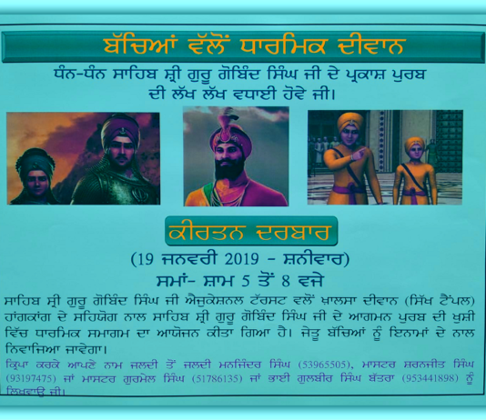 ਗੁਰੂ ਗੋਬਿੰਦ ਸਿੰਘ ਜੀ ਦੇ ਪ੍ਰਕਾਸ਼ ਪੁਰਬ ਨੂੰ ਸਮਰਪਿਤ ਬੱਚਿਆਂ ਵੱਲੋਂ ਧਾਰਮਿਕ ਦੀਵਾਨ ਅੱਜ